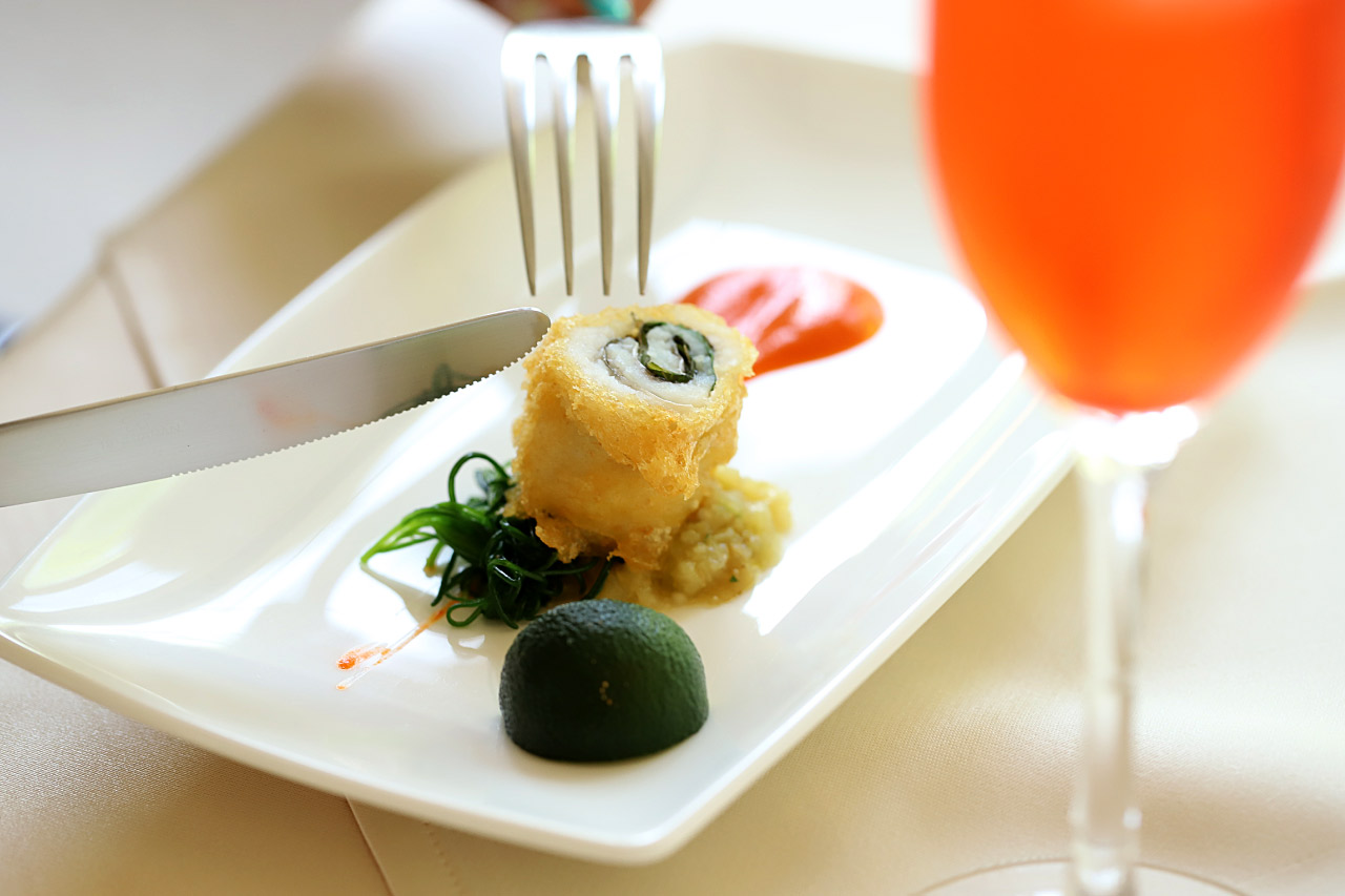 B・Cコースには食前酒が付き、このアペリティーヴォをより楽しむためのおつまみが最初の一品。ふわふわのハモをビールの気泡でカリッと仕上げた、鱧のビール衣揚げを。