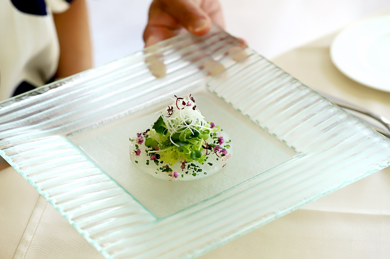 美麗なるガラスのプレートに盛り付けられた冷たい前菜が、とっても涼やか。