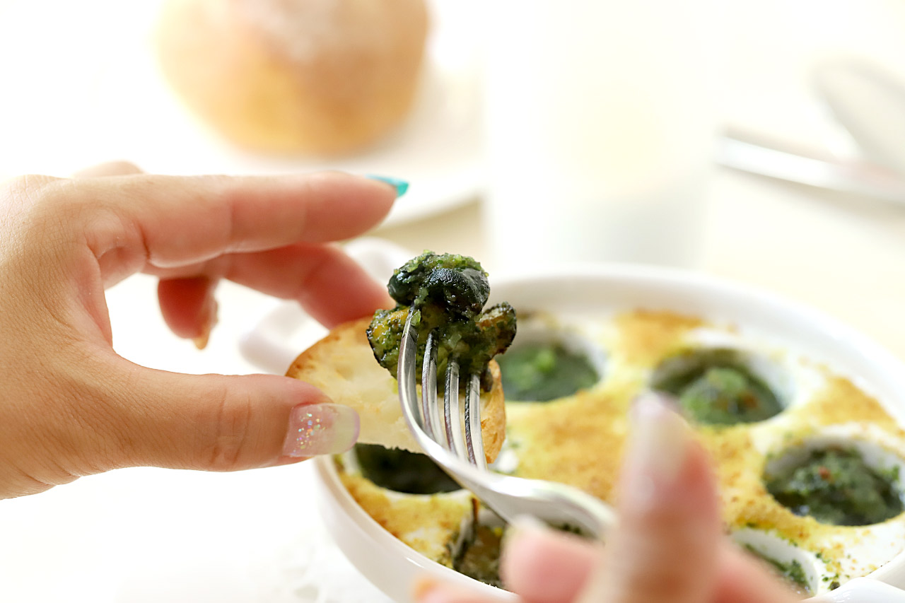 温かい前菜には、サザエのブルギニョンバター焼きを。ニンニクとパセリが香るバターたっぷりのソースで、サザエを肝とともに味わう。ほのかな苦みと旨味がコク深く広がっていく。