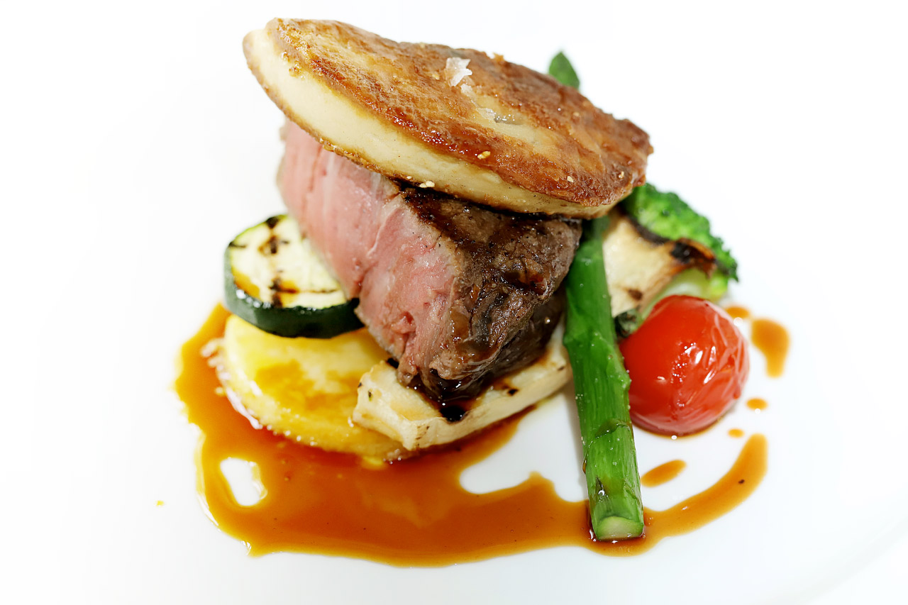 牛フィレにナイフを入れた途端に、美味を確信できる柔らかさ。表面をしっかりソテーしたフォアグラのカリッと食感と、口の中でとろける深い旨みとコク。マルサラ酒を煮詰めた甘めのソースとの相性が秀逸。