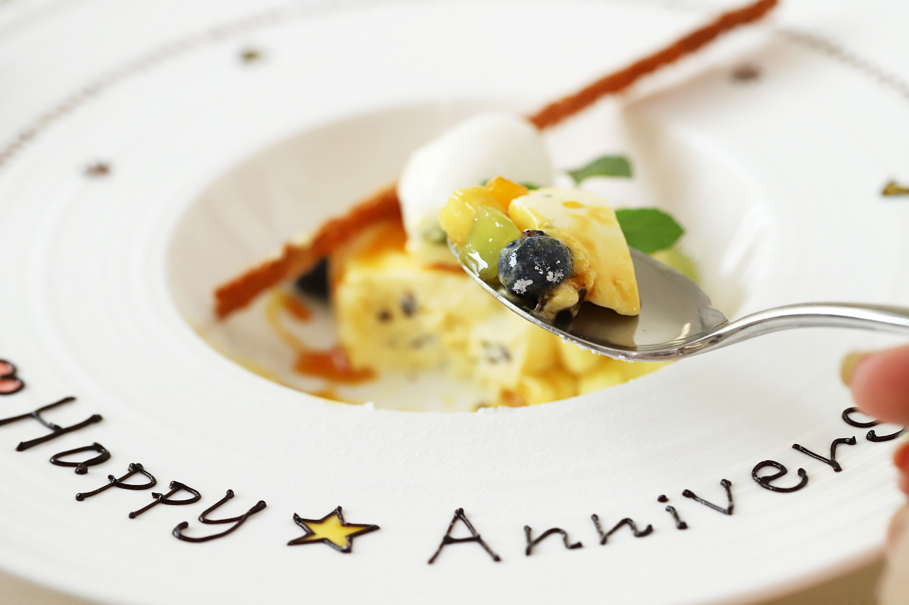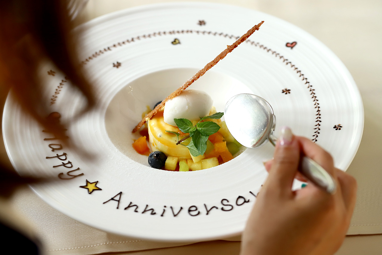 大切な記念日のクライマックスは、このアニーバーサリープレートの瞬間にある。華やかな時間へといざなう、美しきデザートプレート。