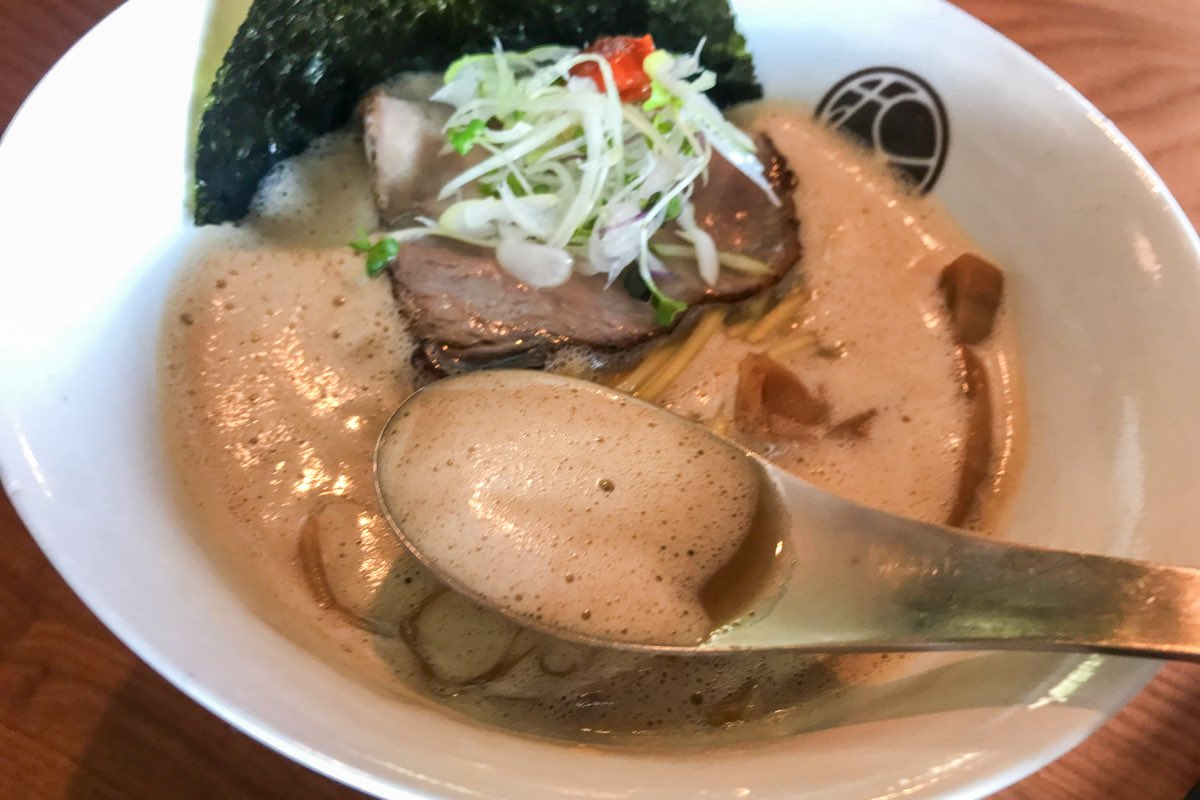 ラーメンは、店名がついた無垢(とんこつしょうゆ)・しょうゆ・SHIOの3種類。まずはやっぱりとんこつしょうゆの無垢をチョイス。泡立て乳化した新進気鋭の泡系ラーメンの極意をいただきまーす。