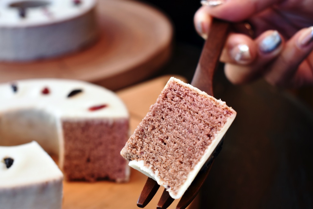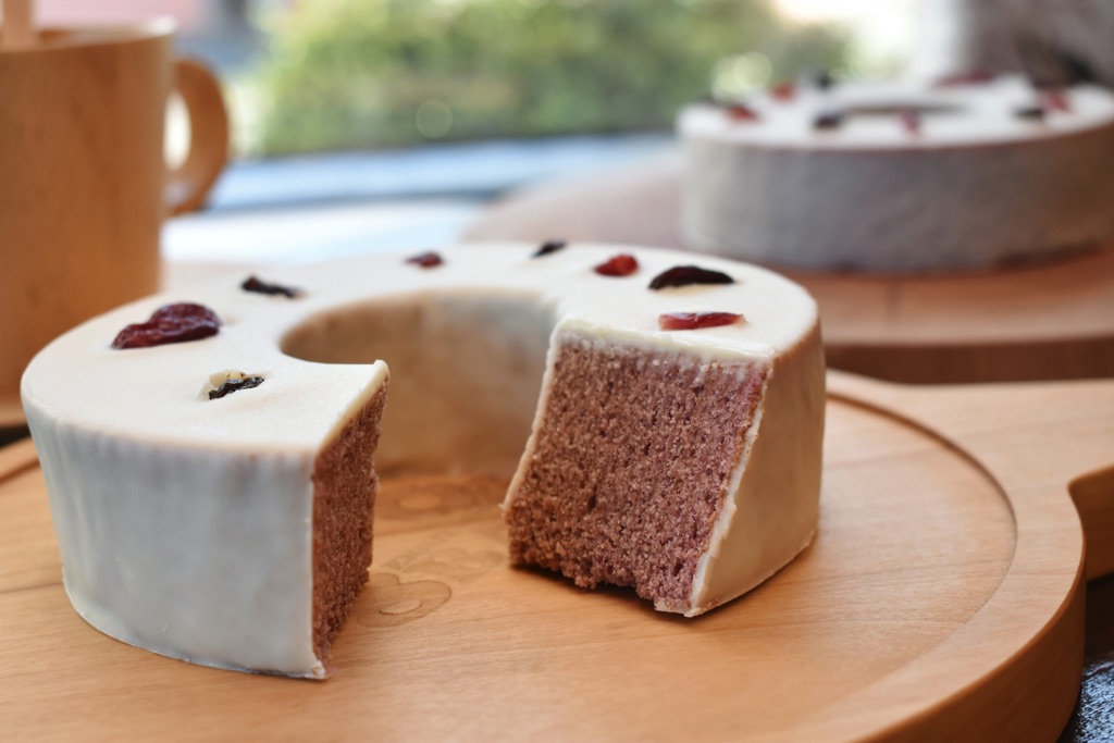 生地には山梨県産のビーツや県産葡萄のピューレ、ワインの搾りかすを再利用したワインパミスを使用し、短時間でしっとりと焼き上げた。