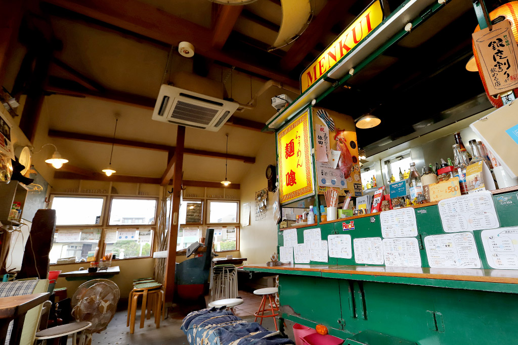 外観だけ見ると、アメリカンバーのようなおしゃれな雰囲気…と思いきや、店内にはドーンとラーメン屋台が‼まるでおもちゃ箱をひっくり返したような賑やかさの中、一度座ると何だか居心地がよく、家のように寛いでしまうから不思議。遊び心に富んだ健さんが織りなすメニューは、どれも美味しくて楽しい。
