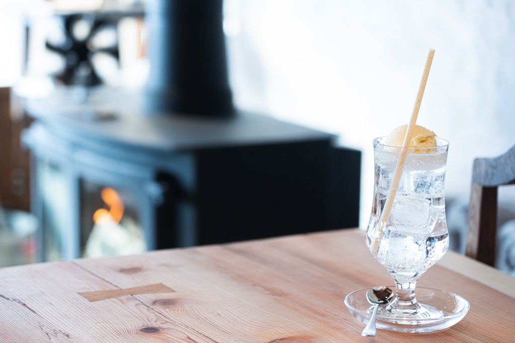 店内には大きな一枚板のテーブル席をメインに、カウンター席やテラス席などを配し、くつろぎの時間が流れる。薪ストーブの前で揺らめく炎を見つめながら過ごす時間もまたここならではのお楽しみだ。