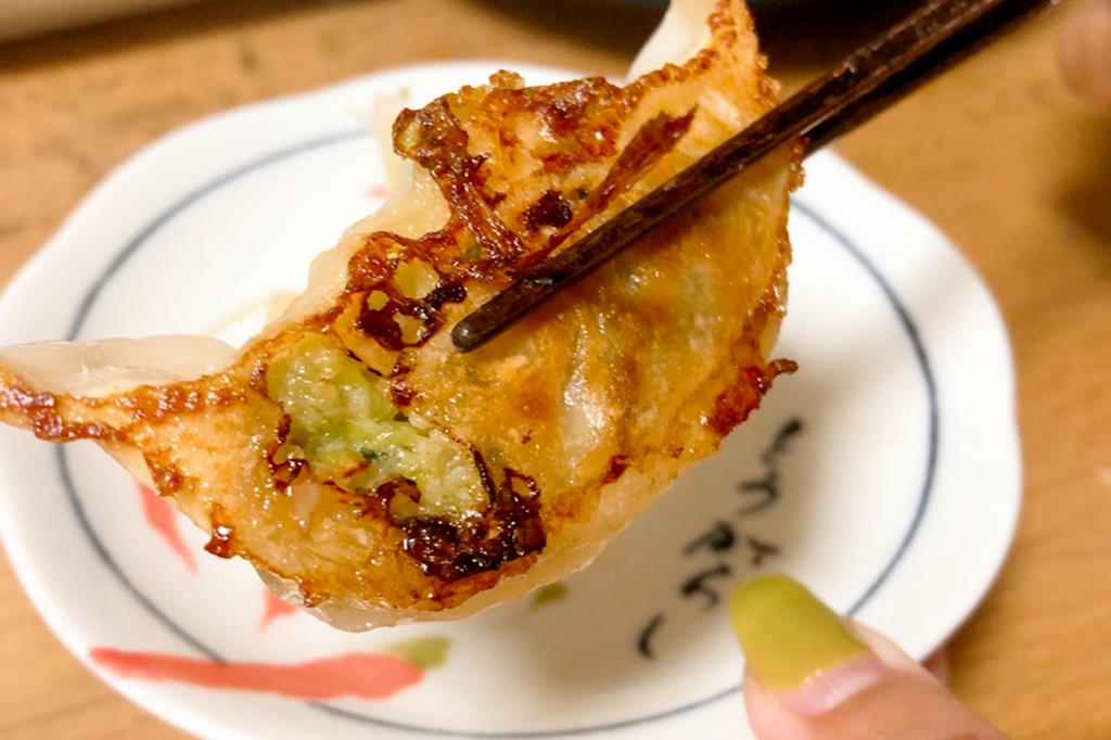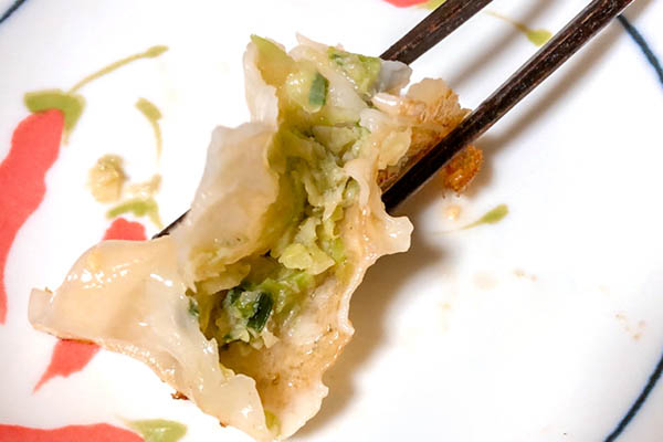 皮が薄いのでパリッと焼き上がり、小ぶりだからパクパクいけちゃう。中はキャベツやニラの野菜がメインのさっぱりした味わい。