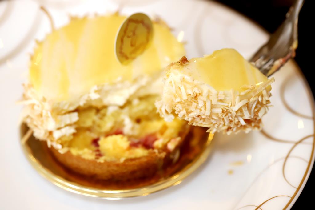 よりはっきりとした桃の味わいを楽しめる赤桃を使ったタルトで、滑らかな山肌をメレンゲで表現した。