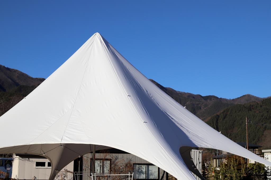 青空に真っ白い三角に広がる“富士山テント”が目印。