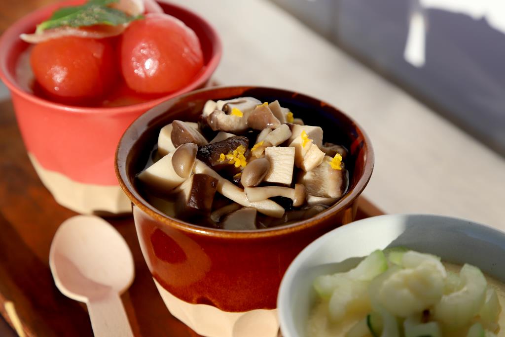 温かい茶碗蒸しは、トマト、生ハム、モッツァレラチーズというイタリアンな組み合わせのAKA、きのこと吉田のうどんというザ・ジャパンなCHA、中に海老団子をしのばせ、キュウリをあしらったアジア風のSHIROの3種類。