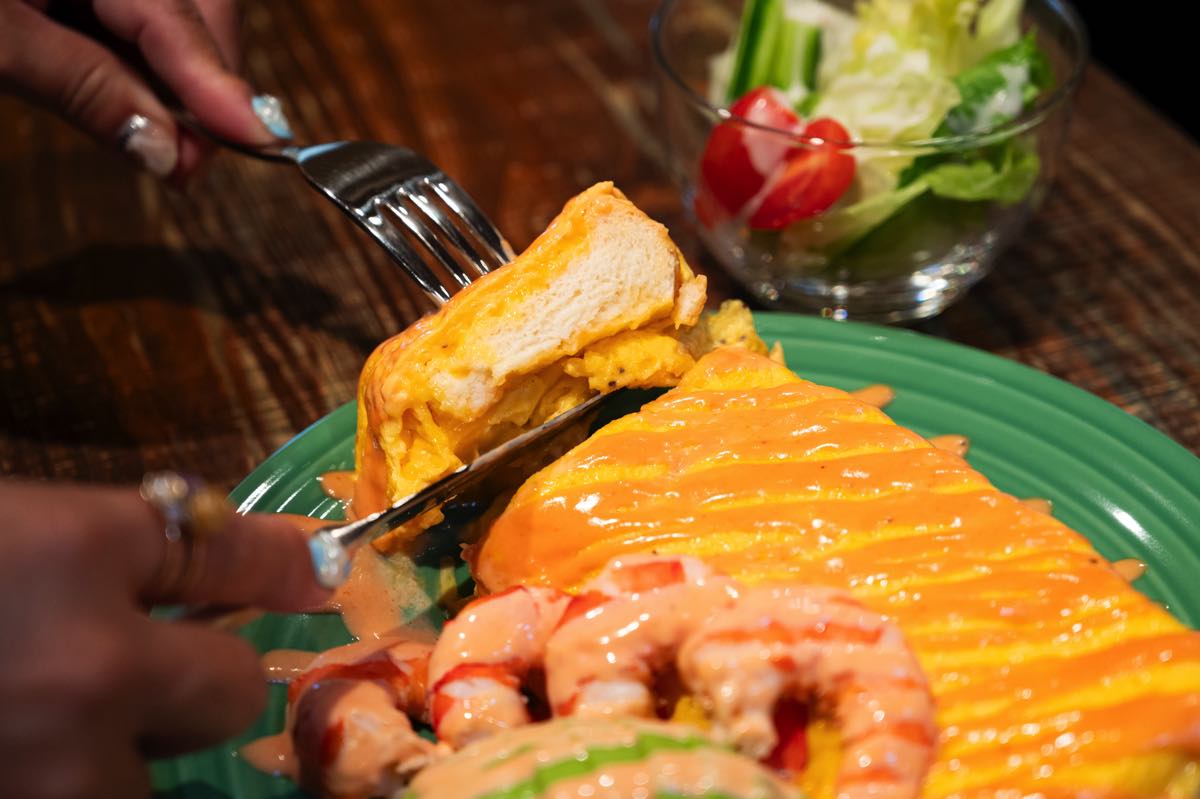 生クリームを隠し味に、ふわっとろに仕上げた卵と、この卵に合うように計算し尽くされたオーロラソースがさらに美味しさを倍増する。