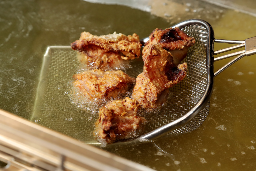 1回しっかり揚げたら取り出して肉汁をとじこめ、カラリと仕上げ揚げ。肉汁をしっかり回して、美味しさが格段にアップする。