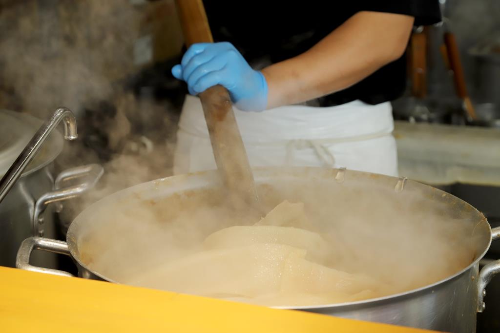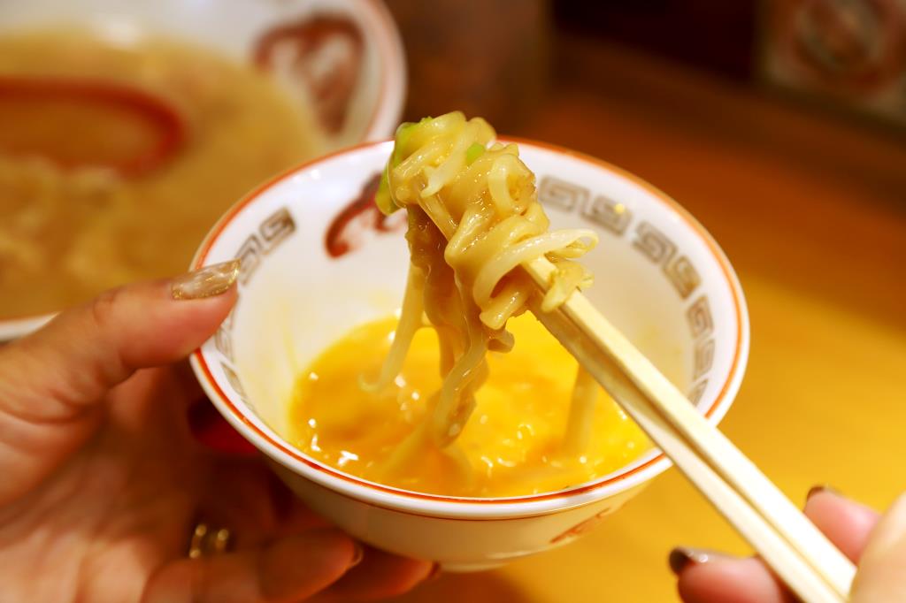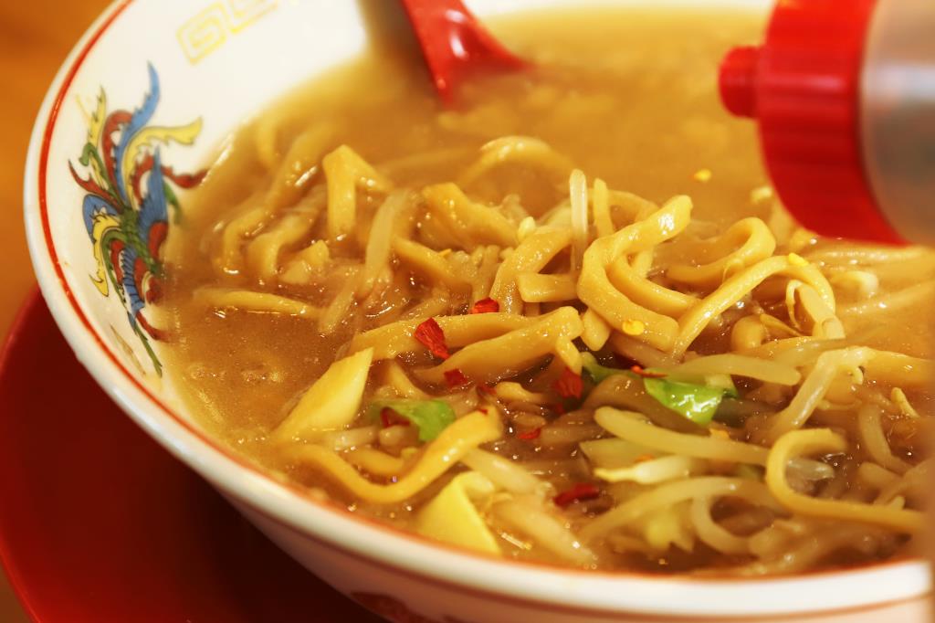 ドンと天地返しで、野菜と麺を入れ替える。コシのある平打ち太麺がスープともよく絡んで、食べ応えも抜群だ。