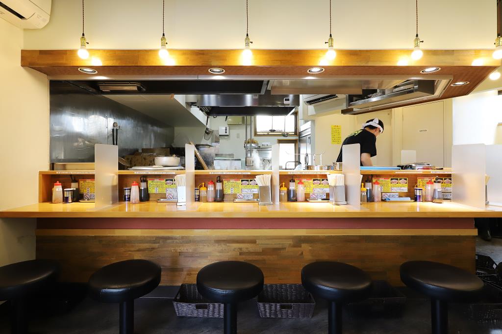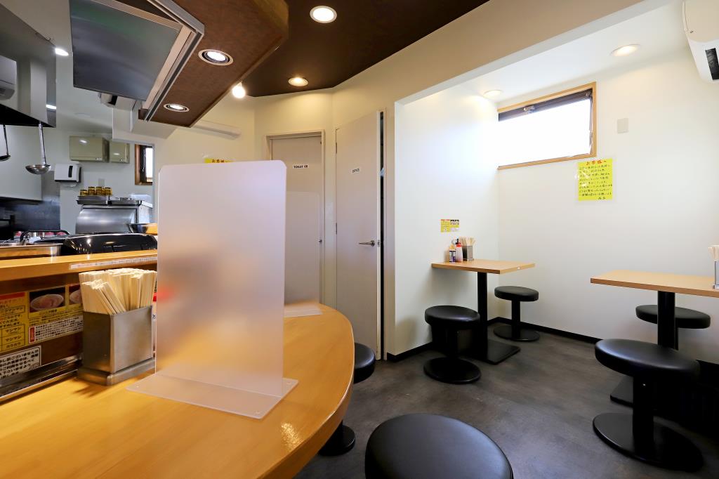 店内はパーテーションで区切られ、新型コロナウイルス対策にも注力したカウンター席をメインに、その奥には二人掛けのテーブル席もあり。