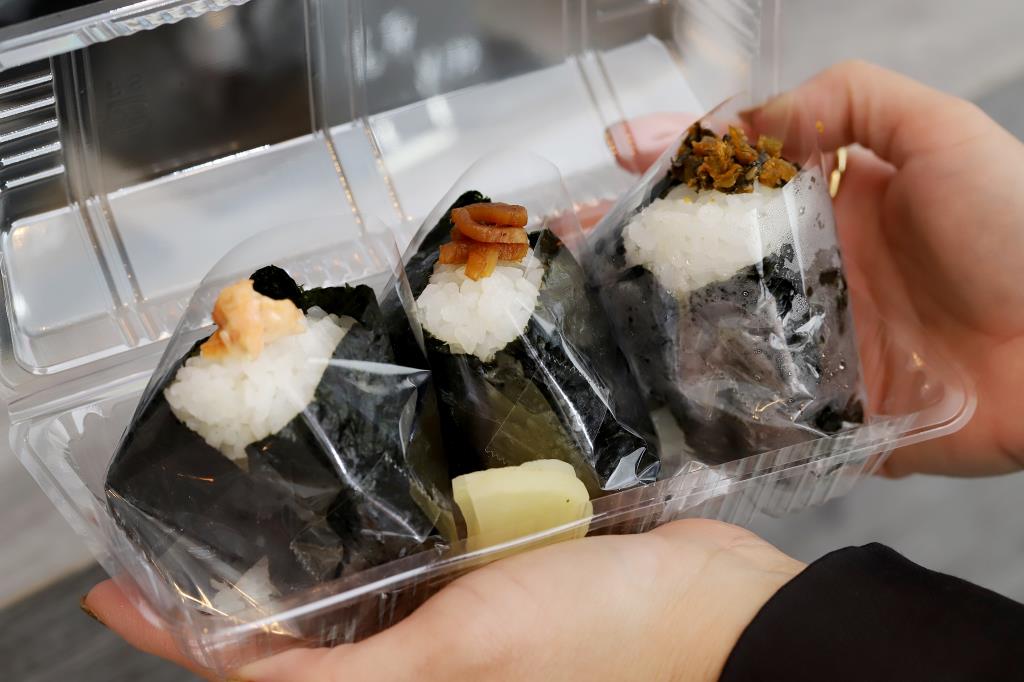 | 主なメニュー | ・おかか 130円 ・鮭 150円 ・和風ツナマヨ 150円 ・鮭マヨ柚子胡椒 180円 ・じゃこマヨネーズ 150円 ・きんぴらごぼう 150円 ・野沢菜ラー油みそ 150円 ・生姜醤油漬け 150円 ・納豆たくあん(大葉入り)150円 ・餃子 300円 ・だし巻き玉子 300円 ※全て税込 |