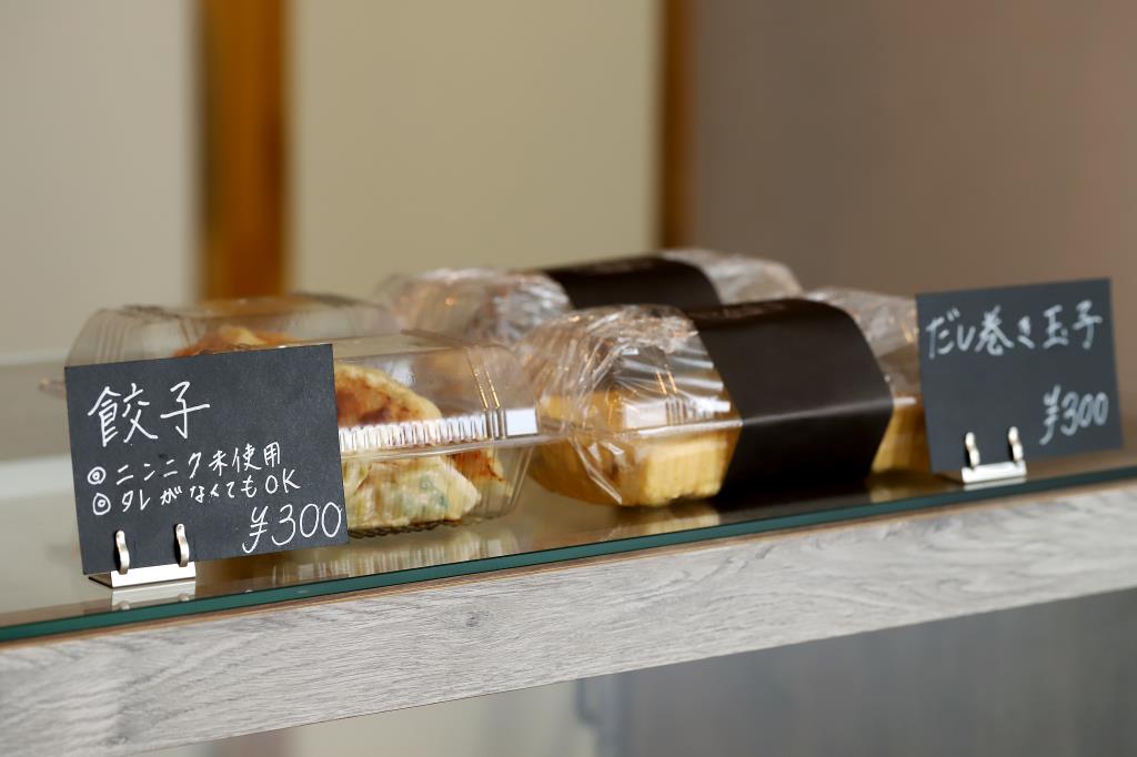 また、ここで手作りしたニンニク不使用の餃子(300円)や出汁がしたたるだし巻き玉子(300円)など、4~5種類のお惣菜が並ぶのも嬉しい。
