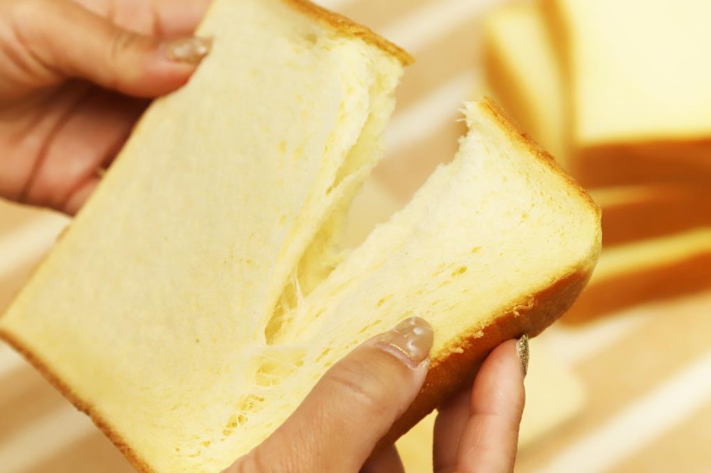 色はかなり黄色みがかっていて、ちぎるとふんわりもっちりとした感触。耳までずっしりとボリューム感があり、しっとり滑らか。