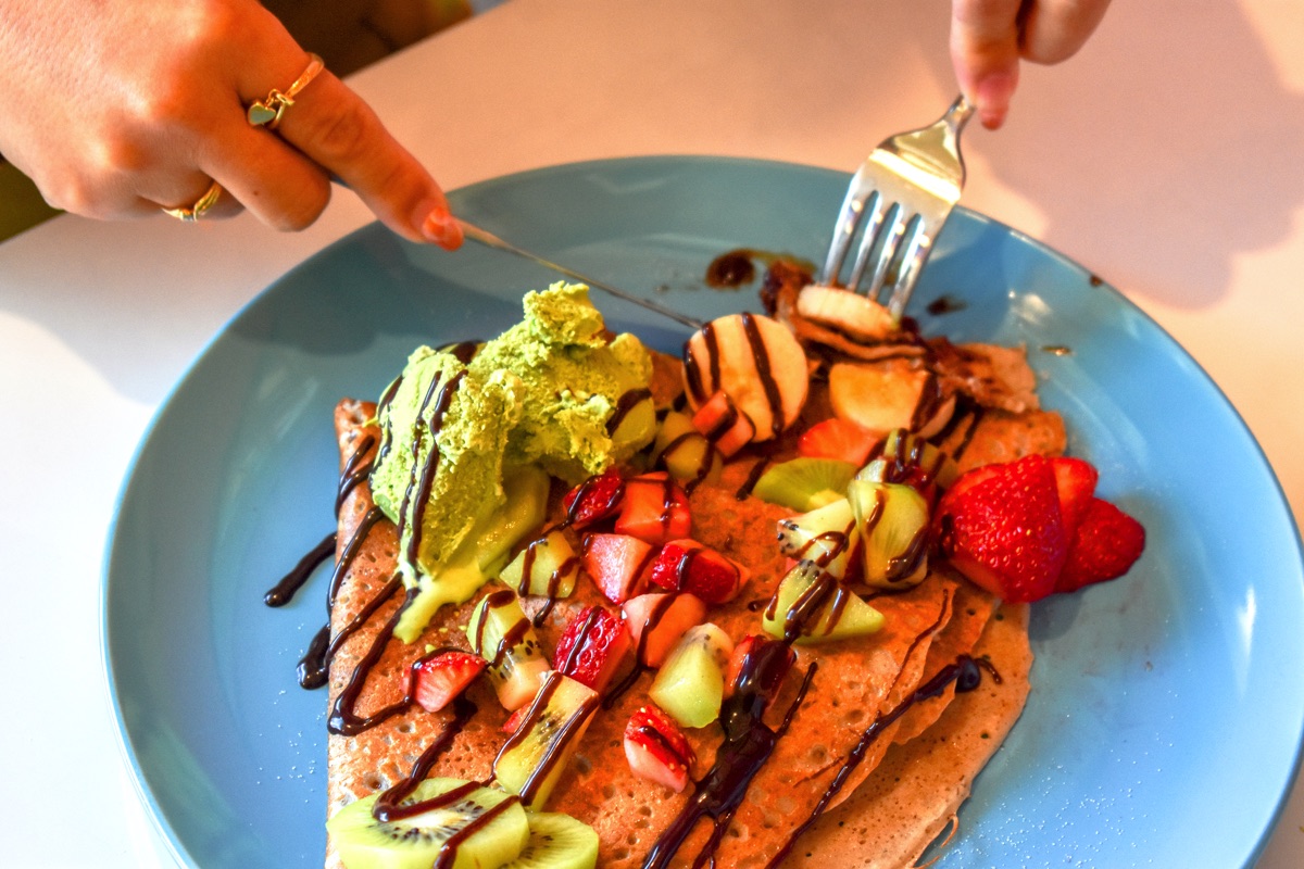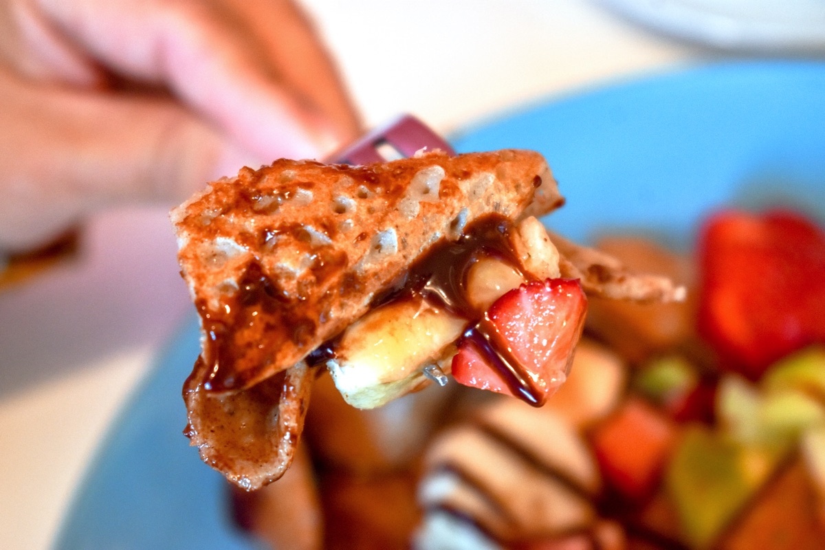 ルチンたっぷりのヘルシーなそば粉のガレットは、こんなスイーツ系でも罪悪感なく食べられるのがいい。