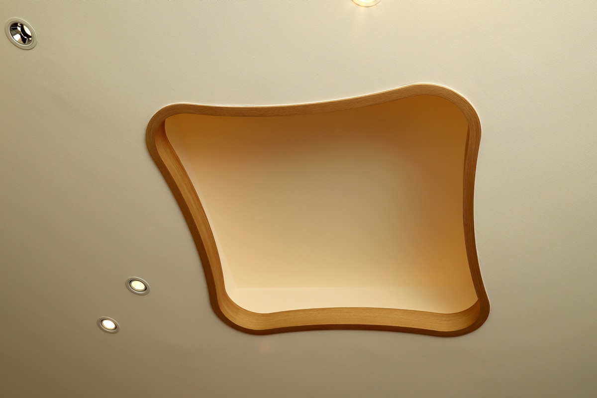 左右の壁の曲線は富士山をイメージしていたり、照明が食パンをモチーフにしていたりと、細部にわたるまで遊び心に溢れる。