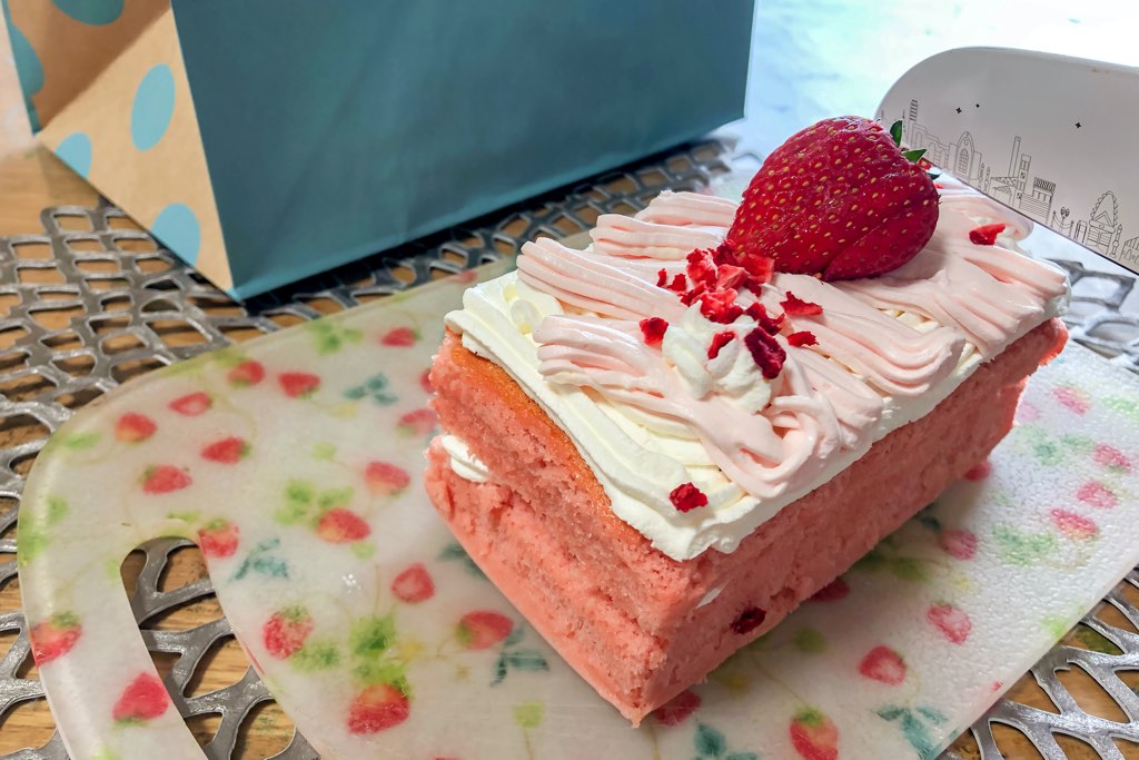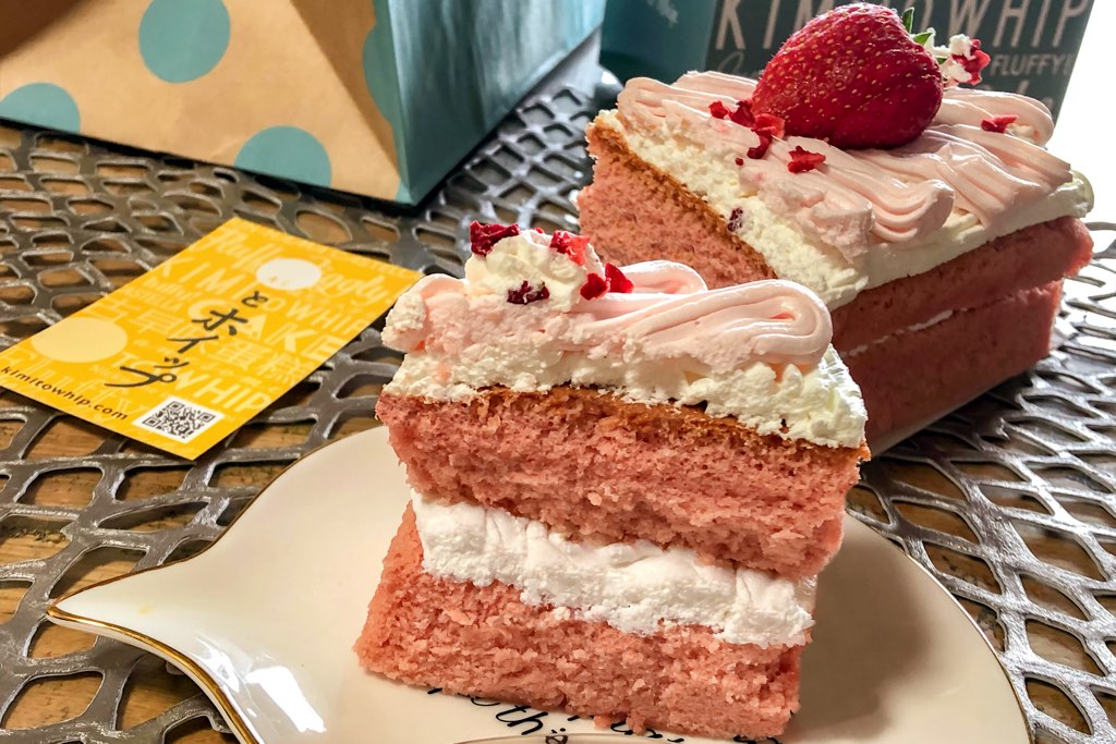 早速包丁を入れると、中はしっとり、台湾カステラのふわっしゅわ食感はそのままに。ピンク色の春らしいカステラ生地が見た目にも可愛い♪