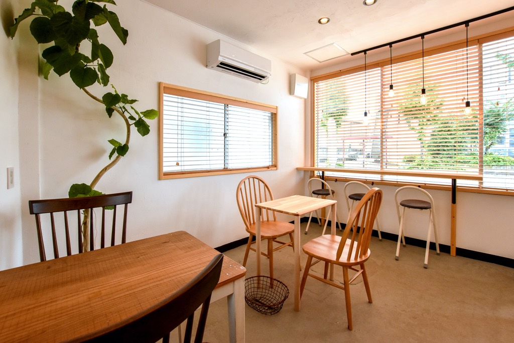 ガラス張りの店内には光が燦々と差し込み、木の温もり溢れる落ち着いた雰囲気が広がる。