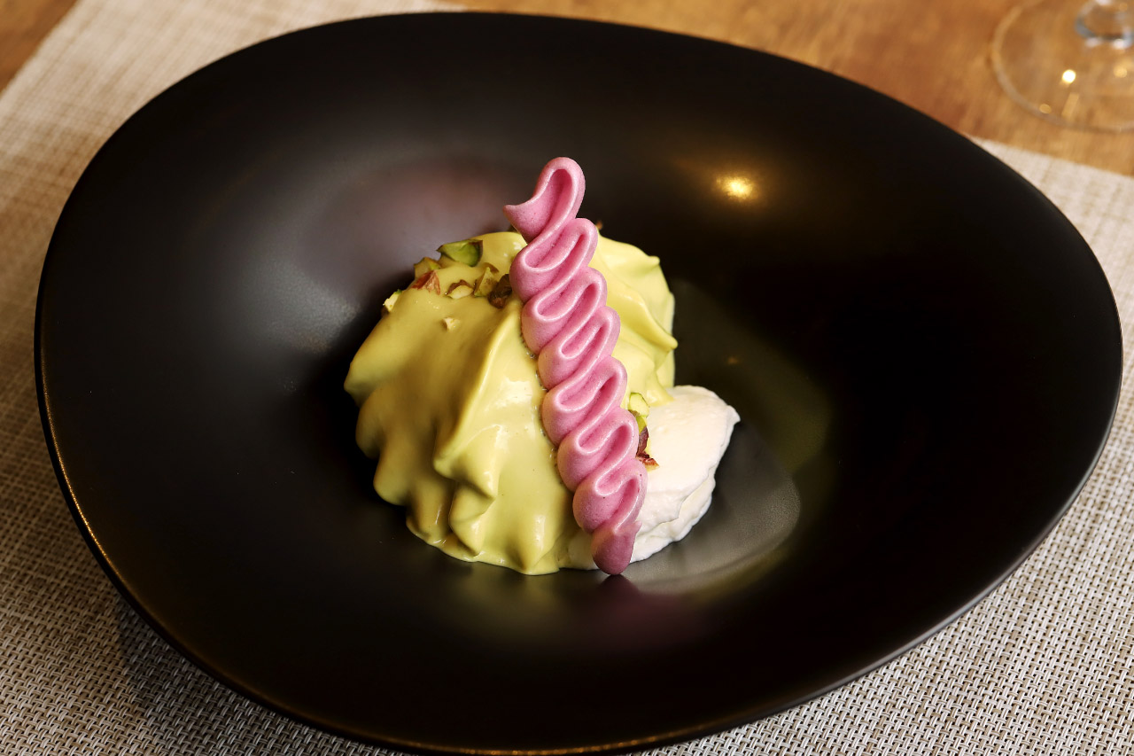 華麗なるコースの締めくくりは、麗しのデザート、ピスタチオのエスプーマ フランボワーズのメレンゲ添え。