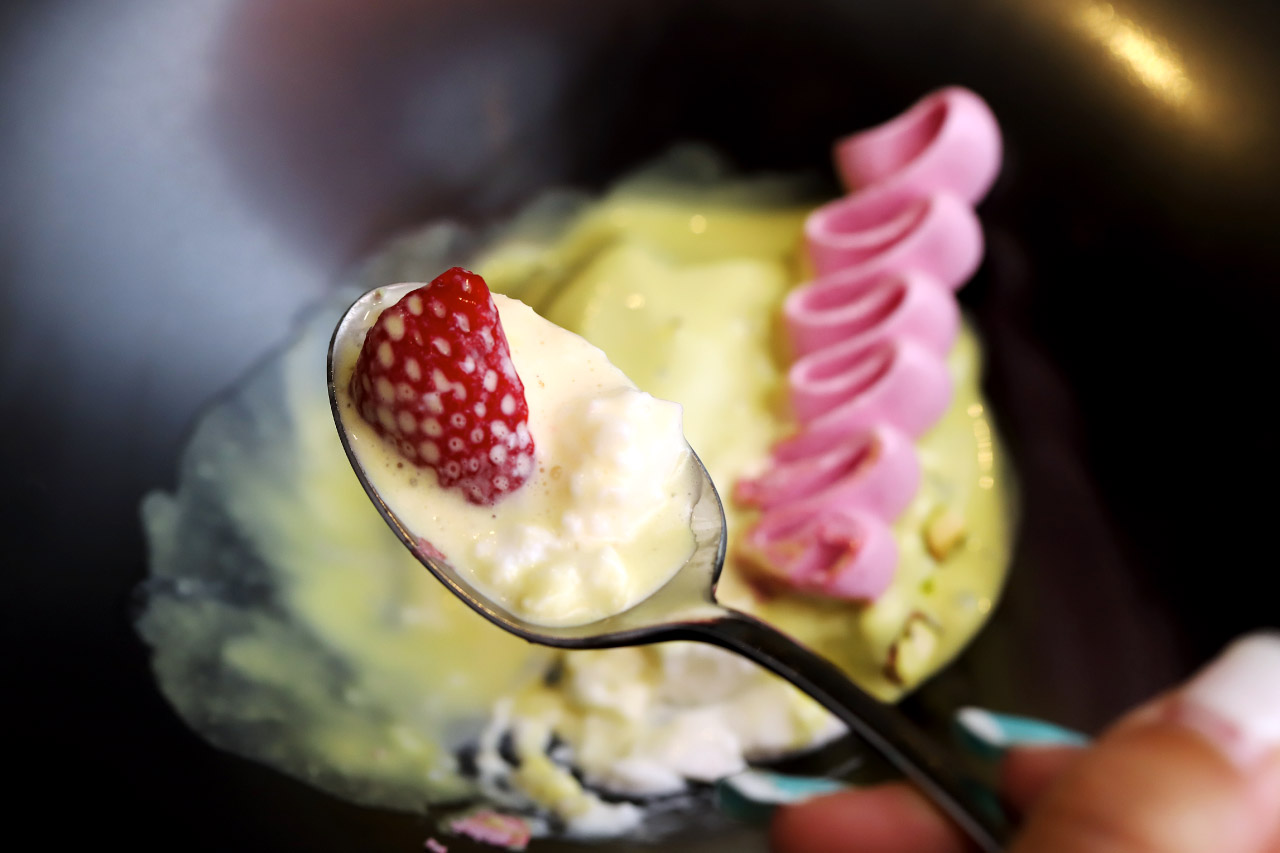 ブラマンジェをクランブル、アーモンドプードル、ホワイトチョコでコーティングし、上から軽やかな泡状のピスタチオのエスプーマを。食べ進めるとストロベリーもお目見えして、さっぱり甘みと酸味を楽しめる。