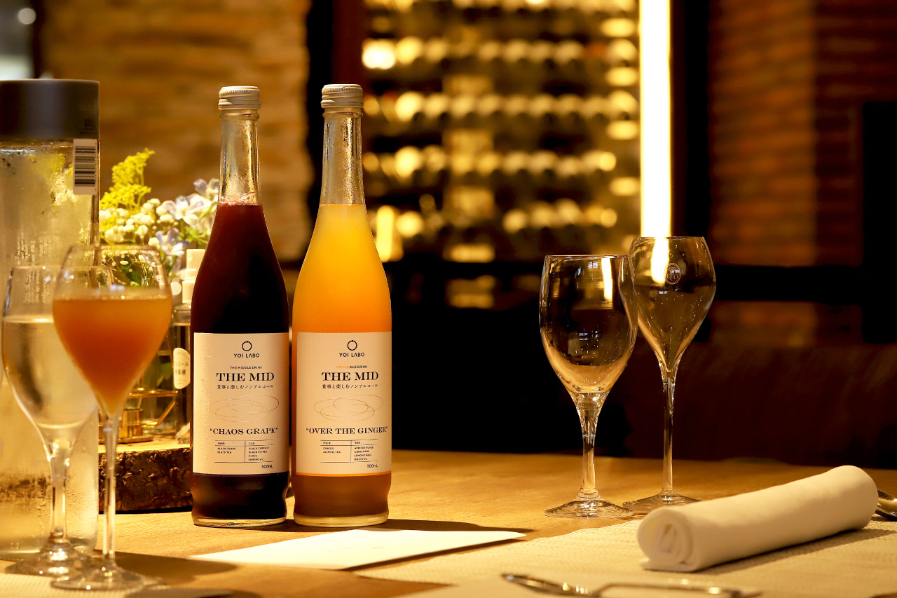 料理と共に楽しむワインはもちろん、今回注目したのはミシュラン店でも導入されている、ソムリエが本気で作った食中専用のノンアルコール「THE MID」。
