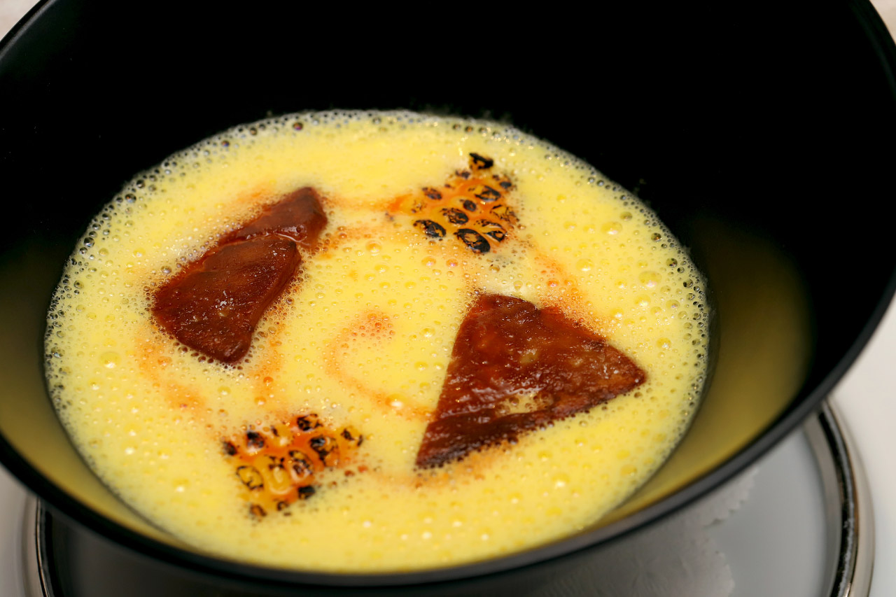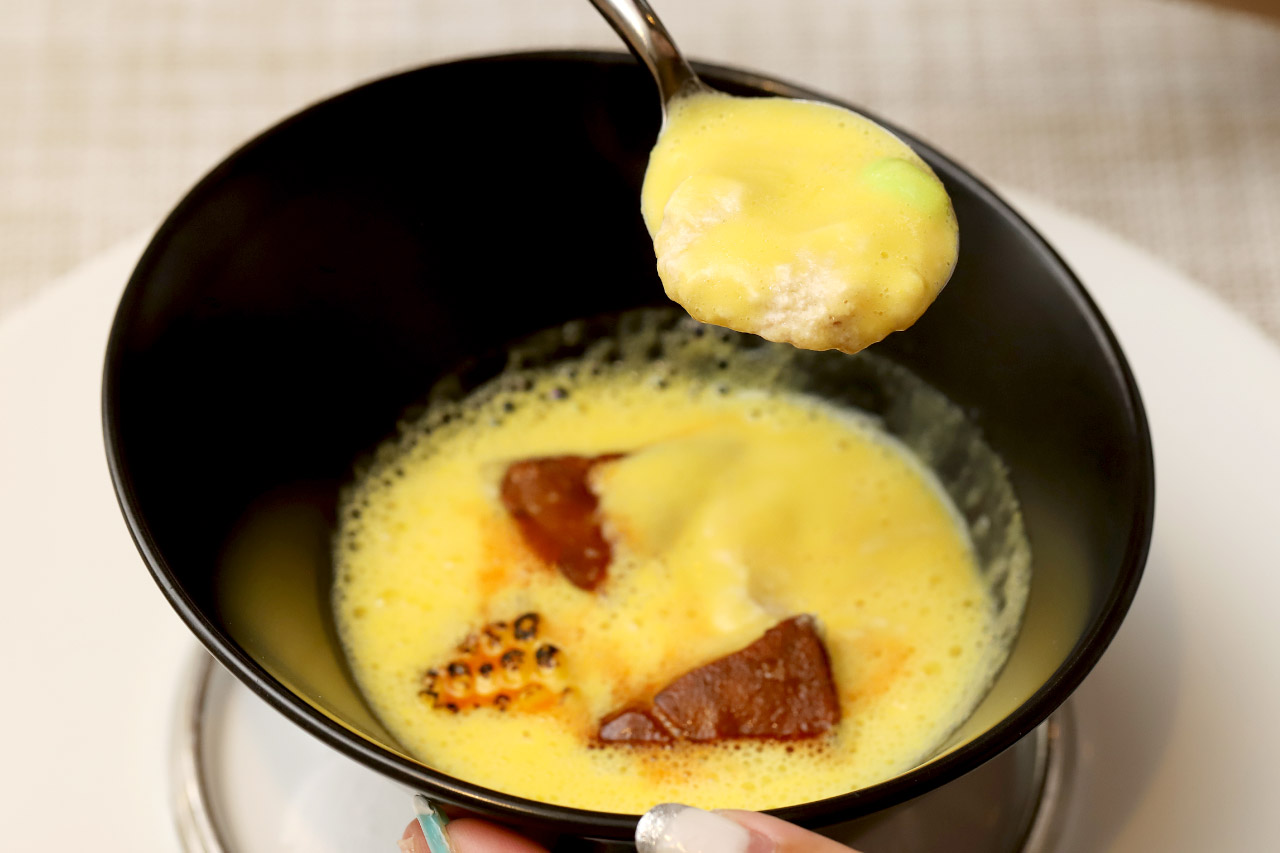 2皿目は、フォアグラのフラン とうもろこしのスープ。