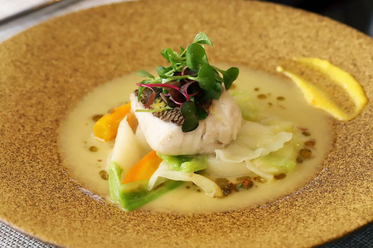 低温調理された真鯛はふっくらしっとり!コクと風味たっぷりの甘めのスープをバターでつなぎ、レモンの酸味が爽やかなラビゴットソースで重さのバランスを整える。