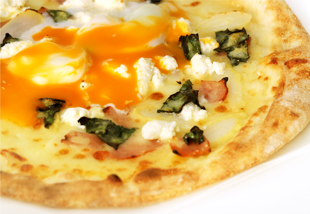 看板のピッツァの中でも人気は、モッツァレラとリコッタチーズがあっさりとした口当たりの「ウォーバエリコッタ」!ホワイトアスパラのシャキシャキ食感がアクセント。また、ボローニャソーセージの繊細な味わいがチーズの旨味とコクと合わさり、美味しさアップ。温泉卵がまるでソースのように絡み、まろやかな味わいに。