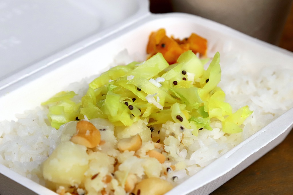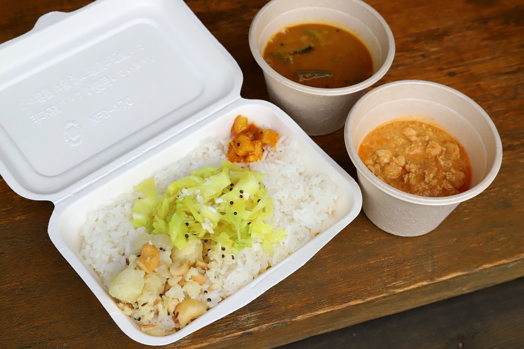 この日は、南インドのマッシュ「ポテトポディマス」、スパイス香る南インドの野菜炒め「キャベツのポリヤル」の2種類のお惣菜に、エキゾチックな風味とシャキシャキ食感がたまらない「浅尾大根のピックル」付き。