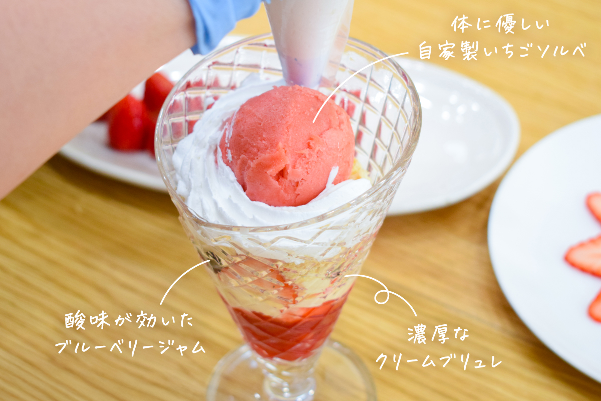 有機さとうきび100%のオーガニックシュガーを使ったいちごソルベやてんさい糖で作る自家製クリームブリュレなど、店内で販売している大人気スイーツがたっぷり味わえるのも嬉しいポイント!中段にはブルーベリージャム入りで、酸味がアクセントに。
