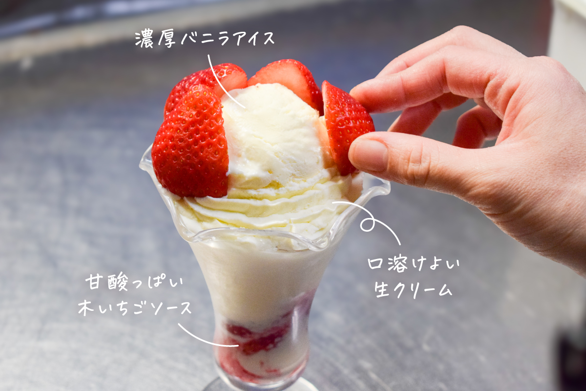 口溶けのよい生クリームやたっぷりの濃厚バニラアイス、下層には甘酸っぱい自家製の木いちごのソースを忍ばせ、いちごの素材そのものの美味しさに加えて+αのお楽しみを堪能できるのも魅力だ。