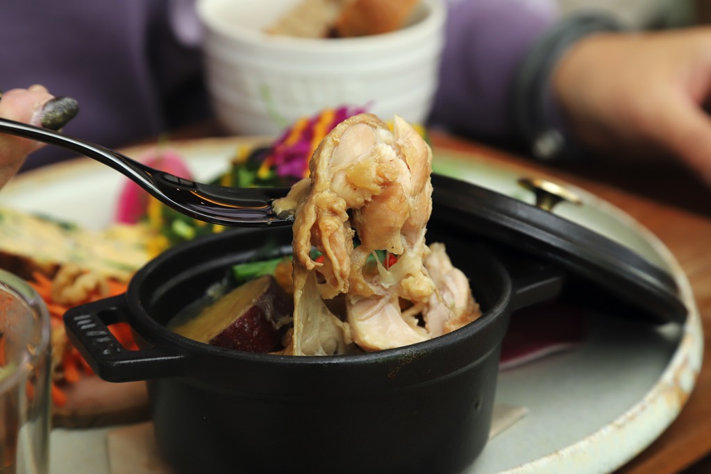 早速、イチオシの「薬膳無水鶏プレート」をオーダーすると、彩り豊かな豪華ワンプレートが!かわいいミニサイズのストウブを開けると、何ともいい香りが広がる。
