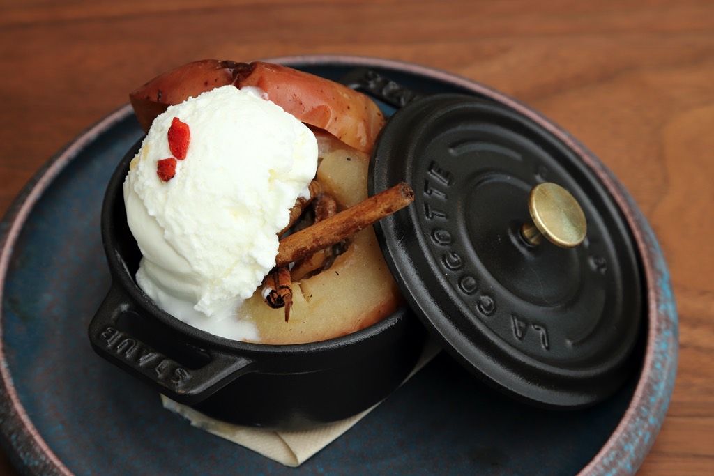 期間限定の「まるごと焼きりんごパフェ」はりんごをまるまる焼き上げ、驚くほどやわらかに。
