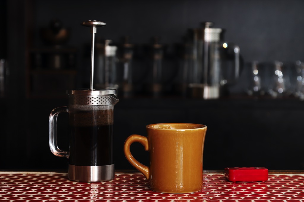 お疲れ気味の朝には、深煎りの“夜のサンタニコブレンド”を。フレンチプレスで、丁寧に淹れてくれたコーヒーを堪能。
