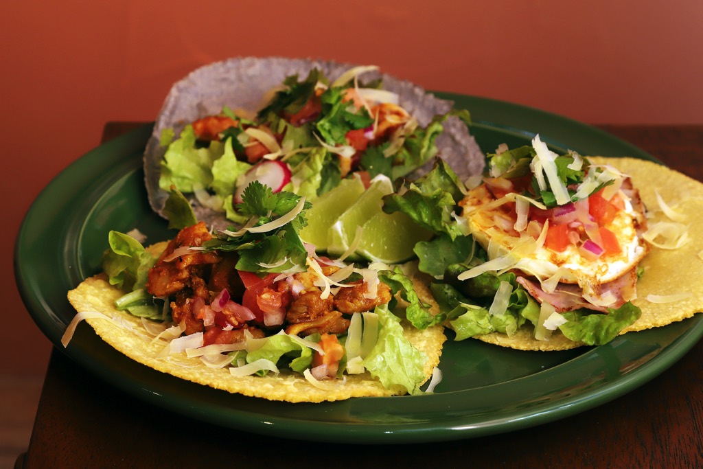 コーンフラワーのトルティーヤはお馴染みのイエローコーンと珍しいブルーコーンの2種類から選べ、ソースも酸味のあるものと辛みのきいたものと2種類から。