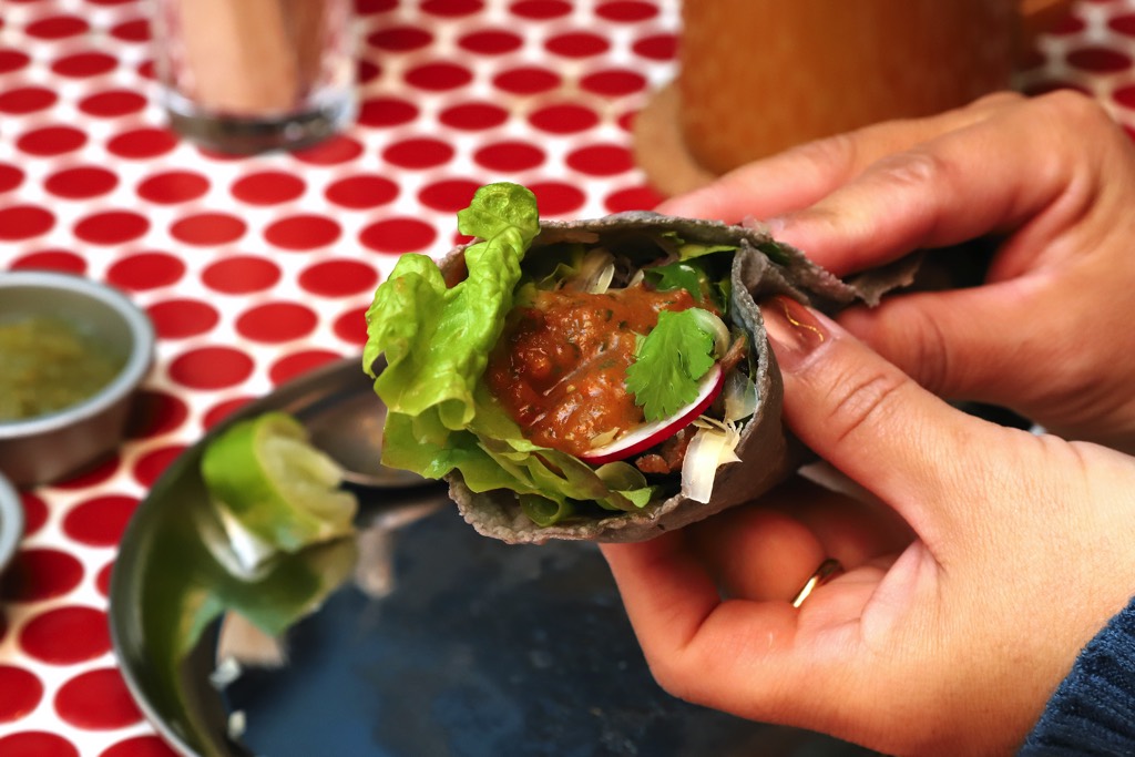 遺伝子操作されていない在来種のブルーコーンは生産者が少ないため、なかなかお目にかかれない貴重なトルティーヤなのだ。