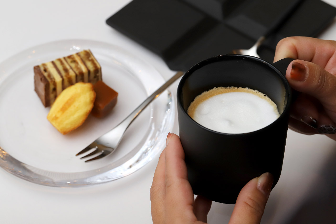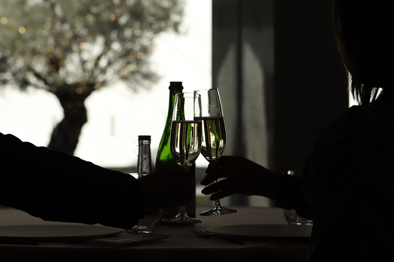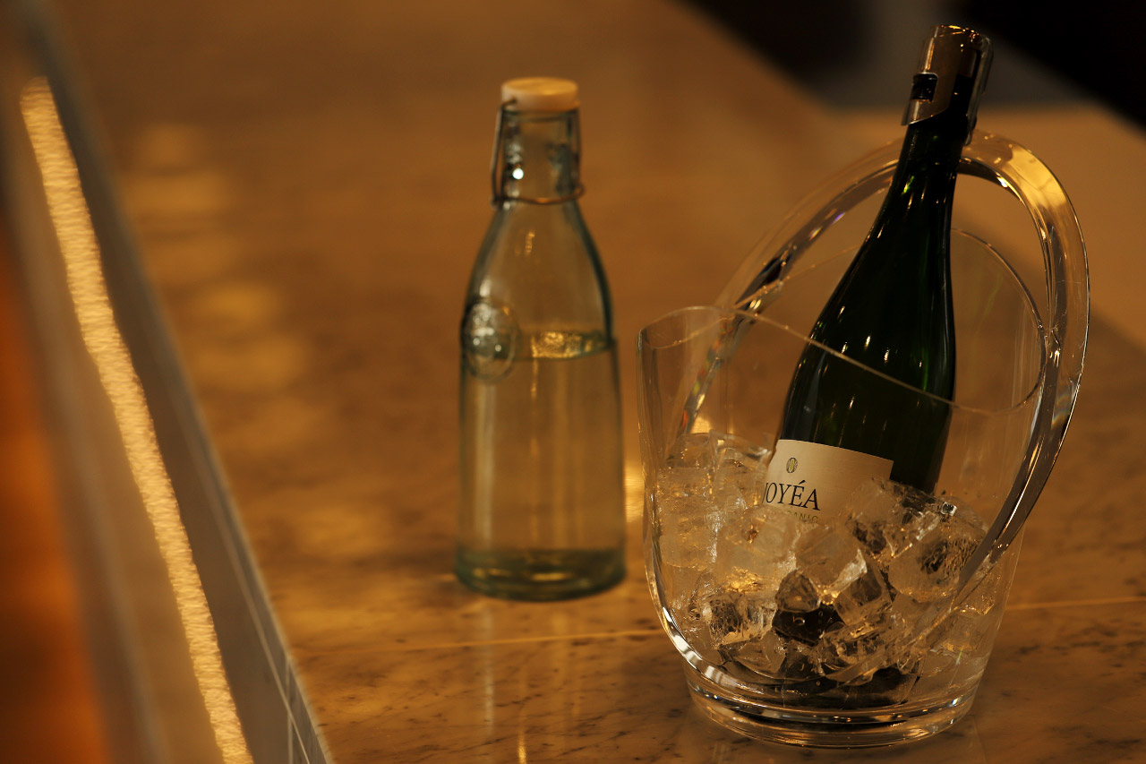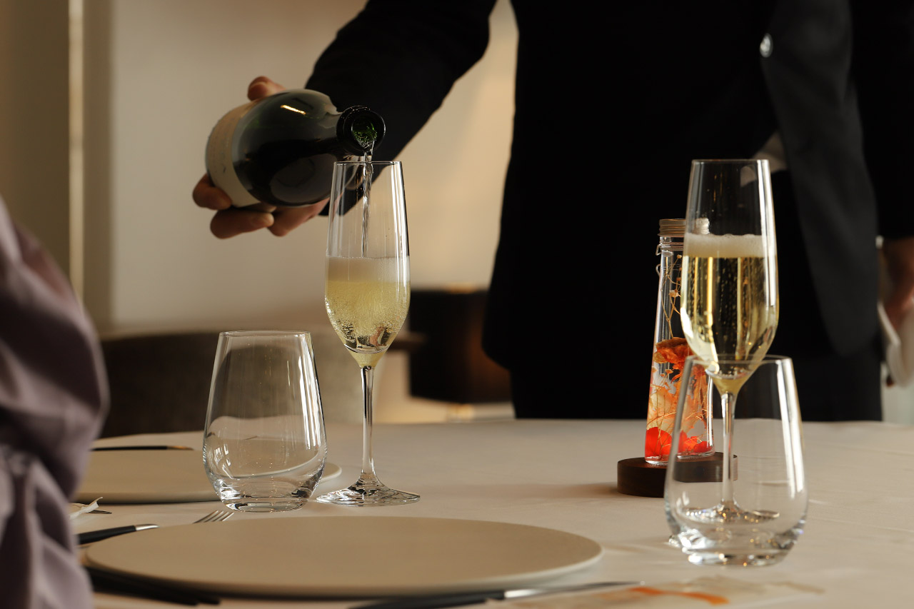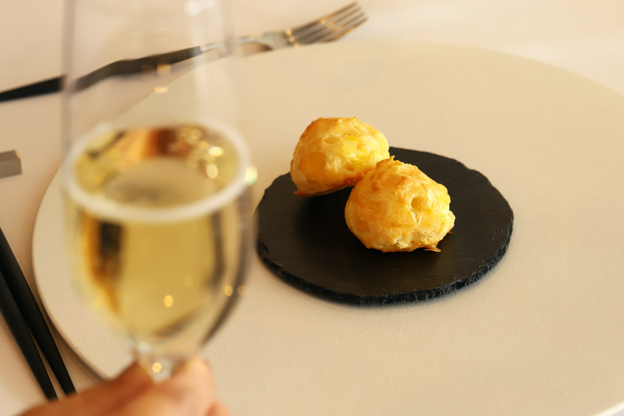 ハイクラスな美意識が集結したクールなダイニングでいただく最初の皿は、キンキンに冷えたスパークリングと焼きたてのグジェールを。カリッと熱々の小さなチーズシューにスタートから心奪われる。