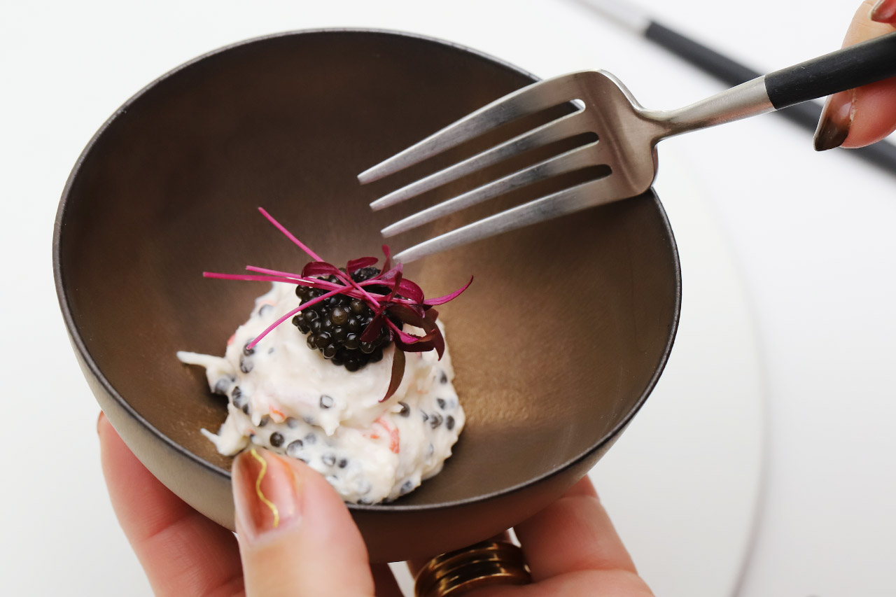 旬の松葉ガニをシンプルに味わうためのサワークリームの酸味、キャビアの塩味が計算された見事なバランスは、ひと皿でしっかりと美味の記憶を残す。新鮮な旬素材の個性が確かに感じられる味わいに思わずほおが緩む。
