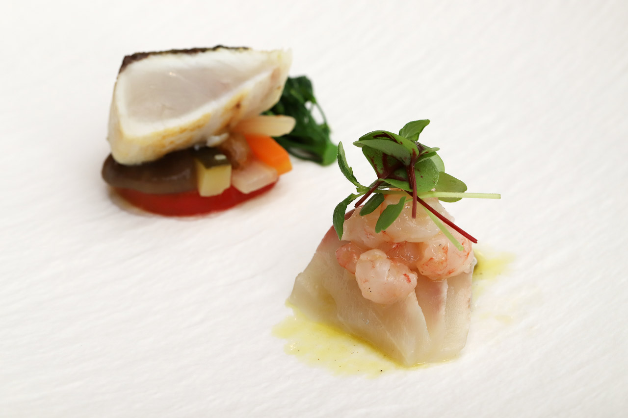 手前にはオリーブオイルで軽くマリネしたアジのスライスと甘エビ。奥側には、表面を香ばしく炙り、中はしっとりと仕上げ、テクスチャーの違いを存分に堪能できる。