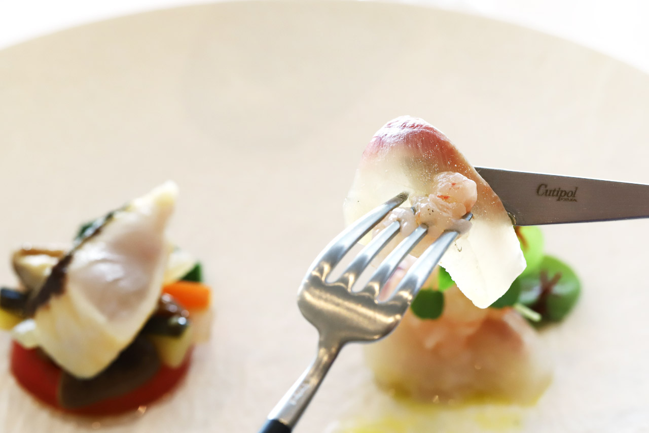 料理長のスペシャリテともいえる前菜のひと皿は、ずっと大切にしている変わらぬレシピのシマアジを。