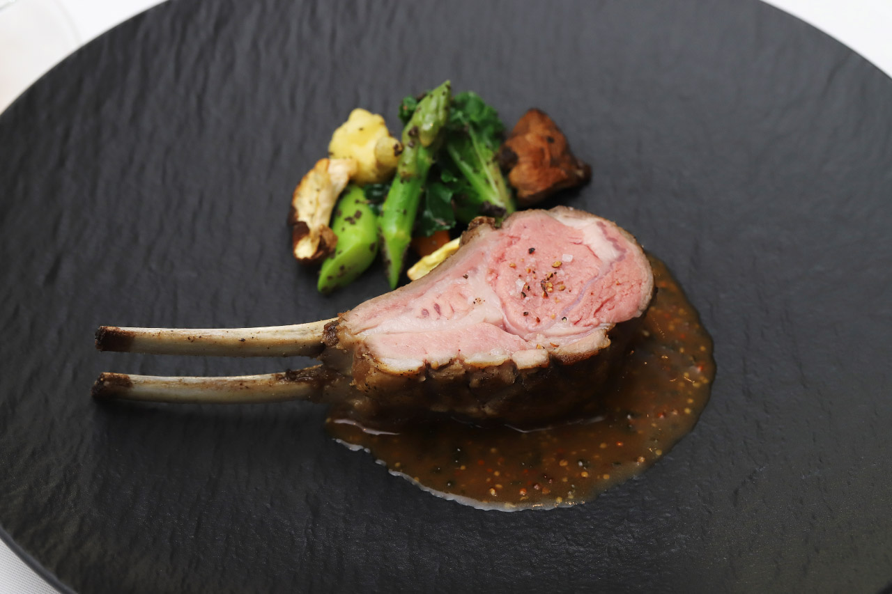 メインにはニンニクと香草でローストした子羊を。肉にしっかり味がしみ込んでいるため、ソースはあくまでもサブ的存在に。子羊の出汁にマスタードで酸味をプラスし、トリュフがほのかに香る。カラリと揚がったくわいのフリットやプチヴェール、アスパラなどの美味しさもまさに主役級。