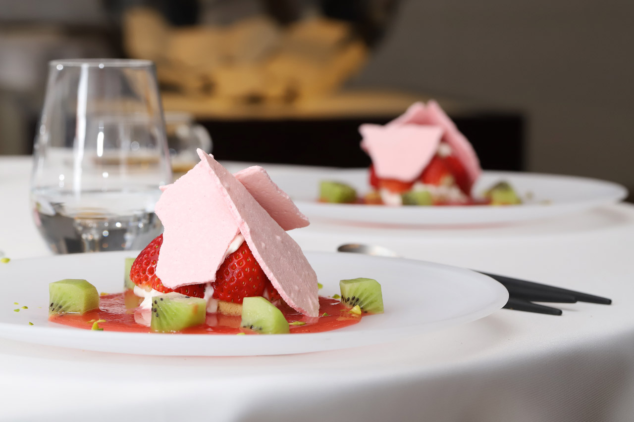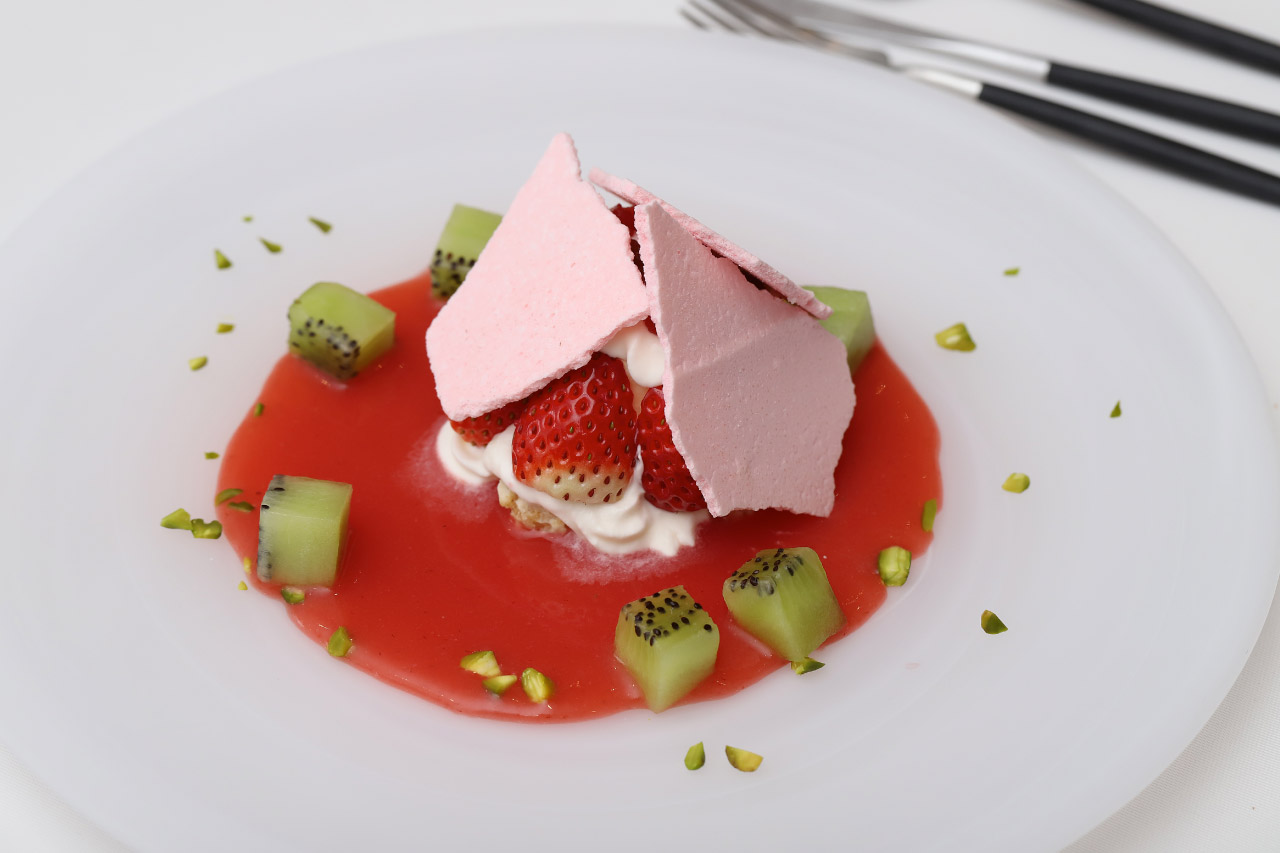 新鮮な驚きに出会うクリエイティブなフレンチコースの最後を彩ってくれるのは、美しいいちごのデザート。若きパティシエールのみずみずしく軽やかで、クリアな感性が生んだスイーツは、繊細かつ独創的。