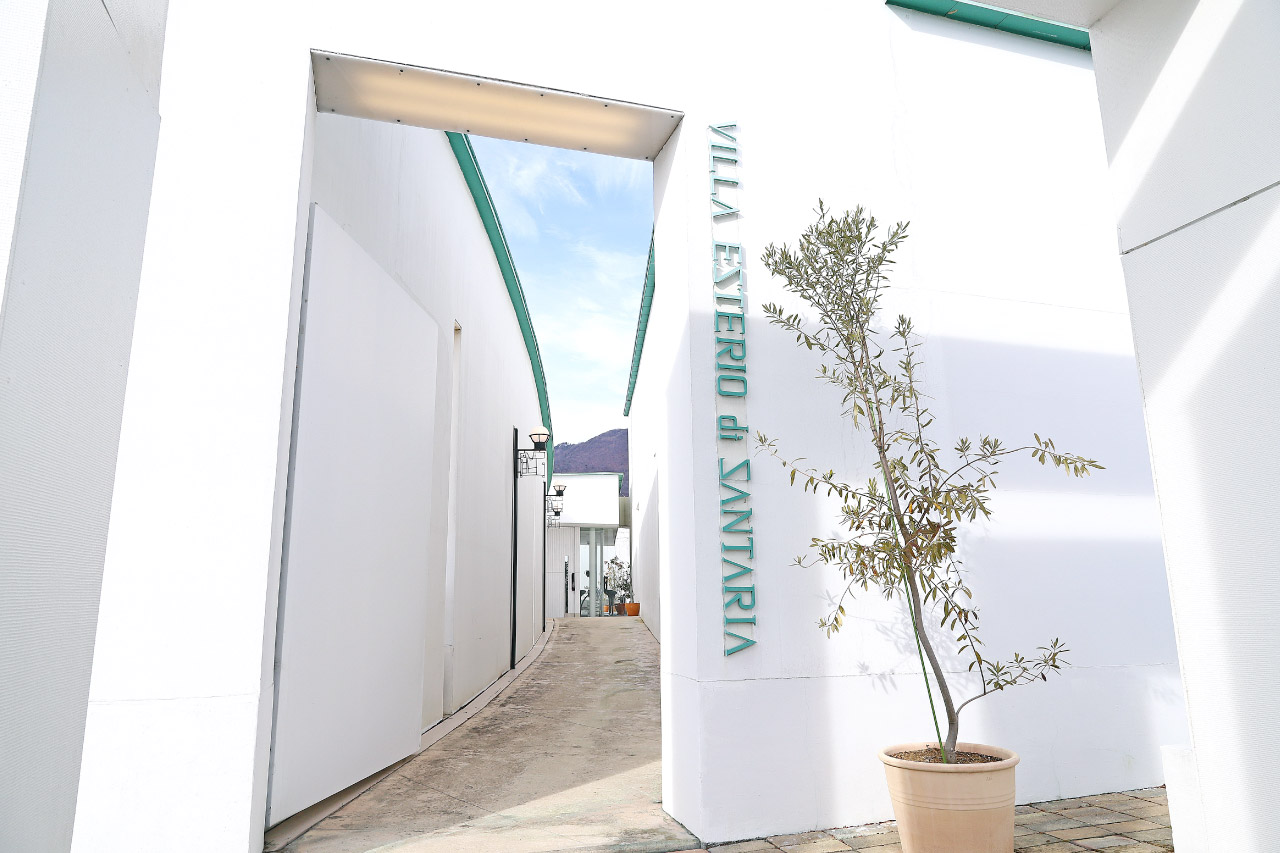 石和温泉駅からすぐ、日常の喧騒から解き放たれた緑豊かな異空間・アリアの中に突如現れる真っ白な建物。