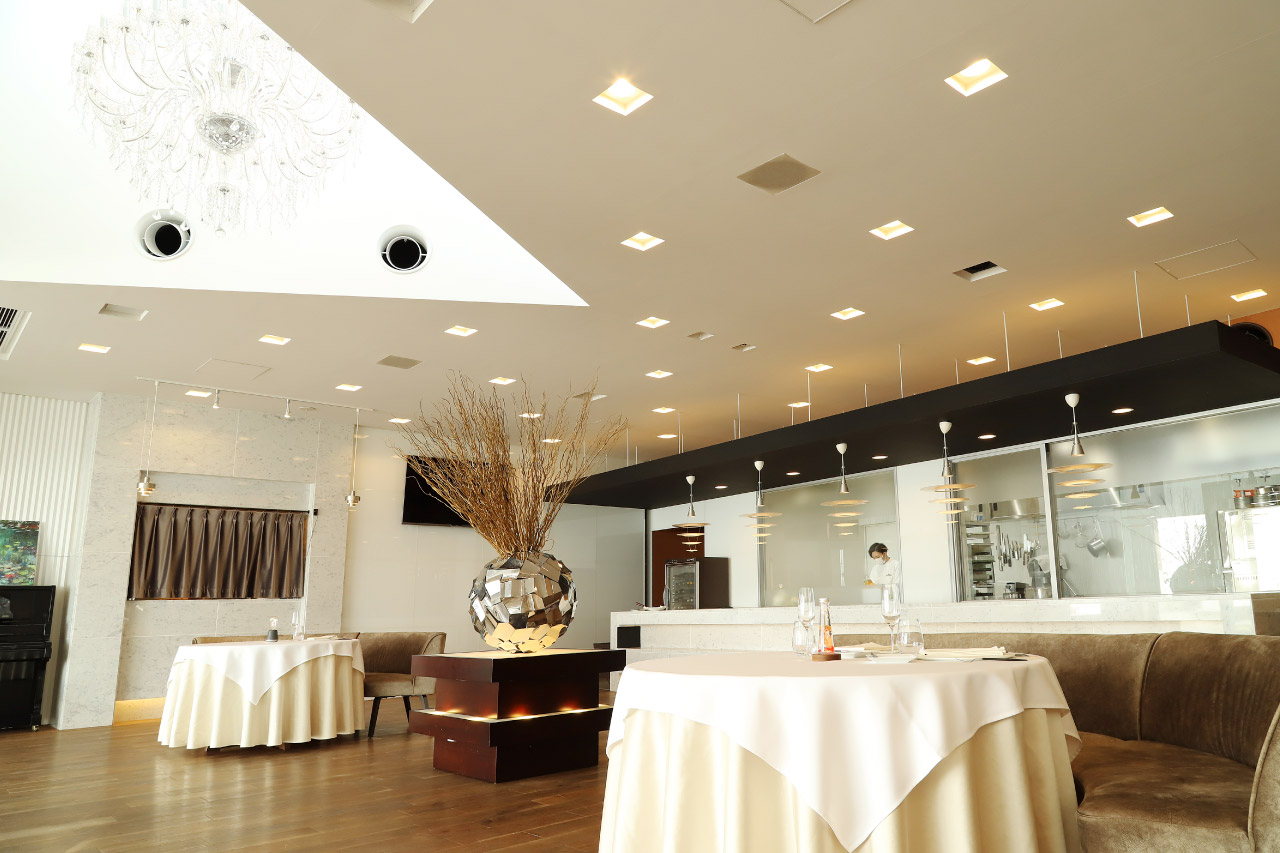 昼は明るい日差しが心地よく差し込み、外の風景を楽しみながら、夜はライトアップされたガーデンを目の前にムーディに、時間とともに表情を変えるこの店ならではのプレゼンテーションに魅了されるだろう。