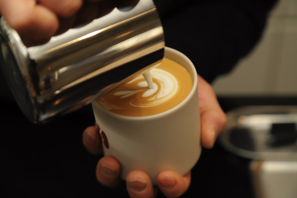 早速、美しいラテアートに魅せられるカフェラテに、自慢のどら焼きをオーダー。