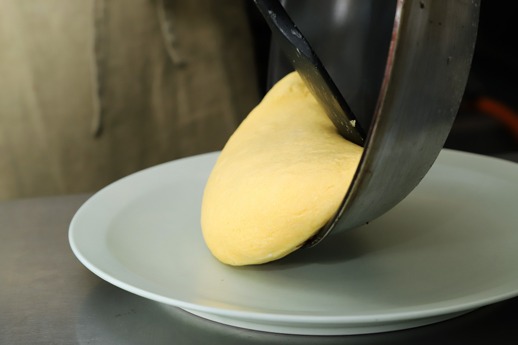 精魂傾けた珠玉のソースを纏い、ひび割れも凹凸もないまるっとした美しすぎるオムライスが完成!