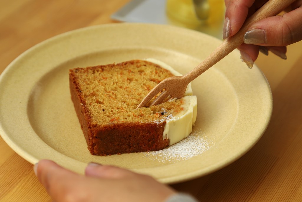 すりおろしキャロットとクルミがたっぷり入った素朴なケーキに、クリームチーズ・ヨーグルト・ホイップの爽やかな特製クリームが華やかな彩りを加える。