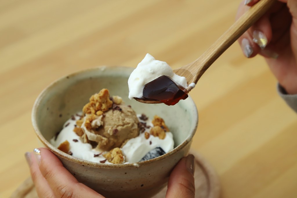 しっかり苦みを感じられるコーヒーゼリーと手作りコーヒーアイスに、カカオニブやグラノーラで食感のアクセントを。ビターな大人味のパフェは洗練された上品な味わいで、ちょっぴり贅沢なコーヒーブレイクをもたらす。
